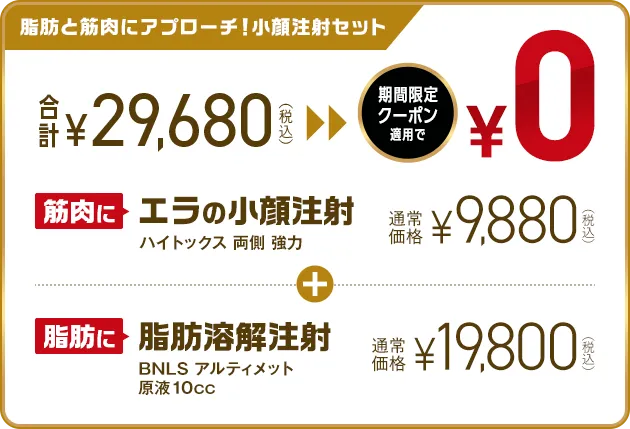 両側・強力:9,880円(税込)発達した咬筋に注射し、エラの張りを解消する施術です。