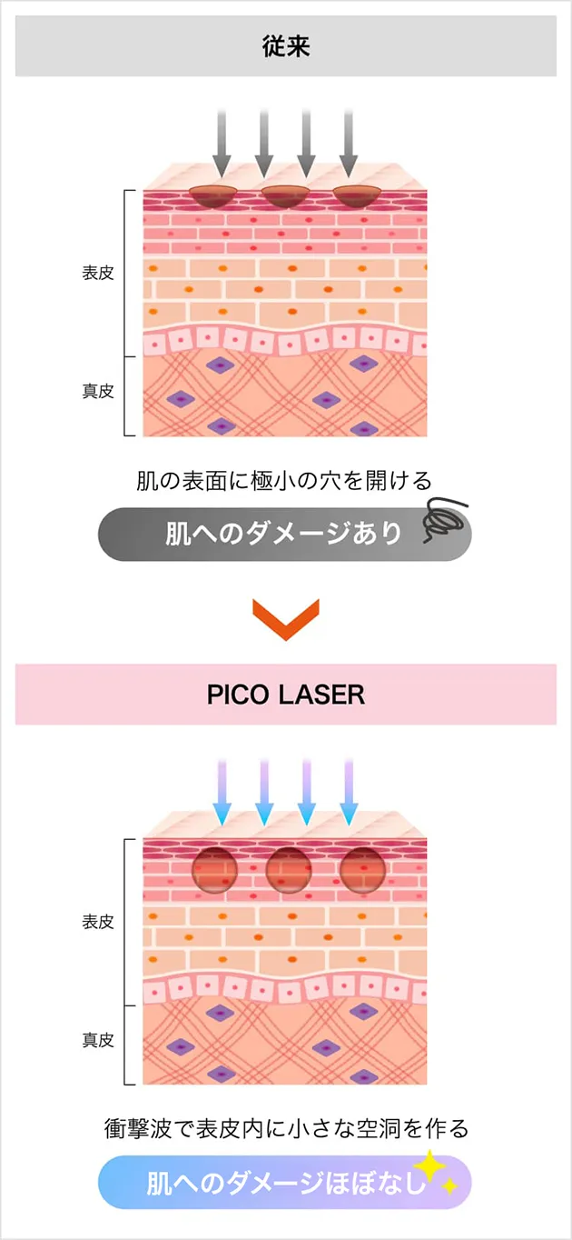 ナノ秒レーザートーニングと違い、「ピコ秒」で照射するPICOLASER(ピコレーザー)は、ナノ秒よりも超短時間で照射でき、組織周辺のダメージが減少、炎症後の色素沈着も起こりにくいというメリットがあります。